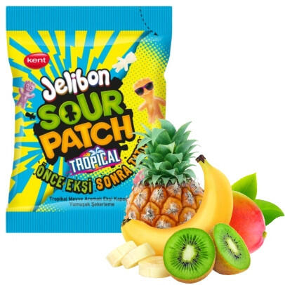 Jelibon Sour Patch Tropical trópusi gyümölcs ízű gumicukor Töltőtömeg: 80g Összetevők: cukor, invertcukor szirup, glükózszirup, keményítő, sav (borkősav, citromsav), színezék (antocianinok, paprika kivonat), aromák, savanyúságot szabályozó anyag(nátrium-hidroxid). Átlagos tápérték 100g-ban Energia 364kcal Zsír 0g melyekből telített zsírsavak0 0g Szénhidrát 90g melyekből cukrok 77g Fehérje 0g Só 0,13g