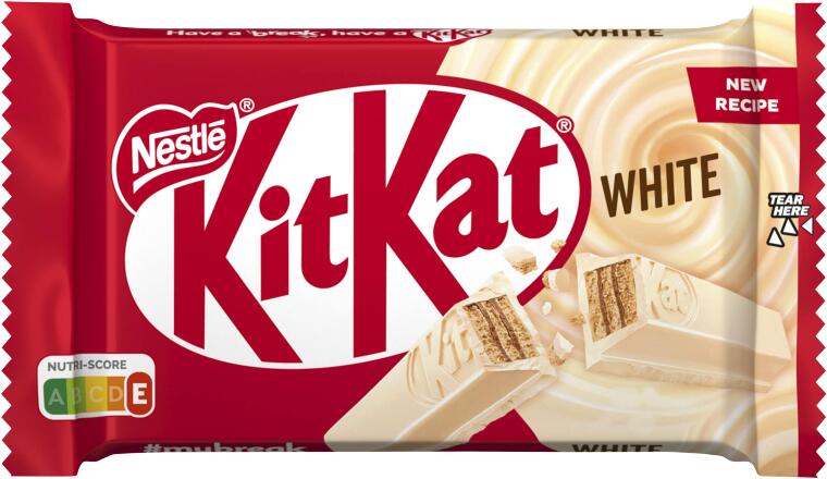 Megnevezés: KitKat White ropogós ostya fehér bevonóval 41,5 g Összetevők: Cukor, Növényi zsírok (pálma, shea, sal), BÚZALISZT (kalciumot, vasat, tiamint és niacint tartalmaz), Sovány TEJPOR, TEJSAVÓPOR, Szárított glükózszirup, Kakaómassza, Emulgeálószer (lecitinek), Természetes aromák, Kakaóvaj, Zsíros TEJPOR, Élesztő, Térfogatnövelő szer (nátrium-karbonátok), VAJZSÍR, TEJSAVÓPOR-készítmény
