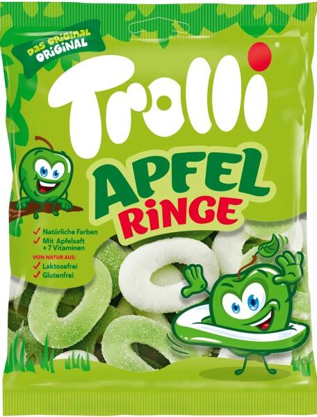 Trolli Sauer Apfelringe 200g Gyümölcsgumiból és habcukorból készült savanyú cukorkarikák. Lenyűgöznek az alma intenzív gyümölcsös ízével... Hozzávalók: Glükóz szirup; cukor; 12% almalé almalé koncentrátumból. zselatin; savanyító anyagok: citromsav, tejsav. Nedvesítőszer: szorbit; festék (spirulina, spirulina). Aroma; niacin; E-vitamin; pantoténsav. B6-vitamin; Folsav; biotin; B12 vitamin. Allergének: nincs megadva. Tápértékek 100 grammonként: energia érték 1428 kJ / 336 kcal Zsírok 0 g ebből telített zsírsavak 0 g Szénhidrát 79 g ebből cukrok 50 g Fehérjék 4,4 g Só 0,2 g Az EU-ban készült.