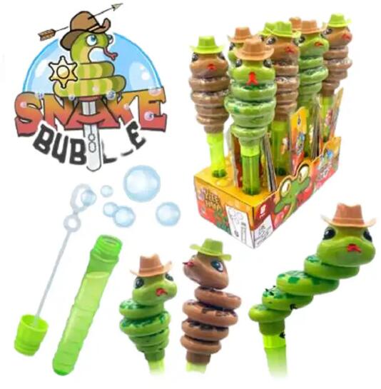 A Snake Bubble (5 g) mókás buborékfújó játékkal és gyümölcsízű cukorkával – puha, rugalmas gumicukor és színes buborékfújó élmény minden egyes darabban. Összetevők: